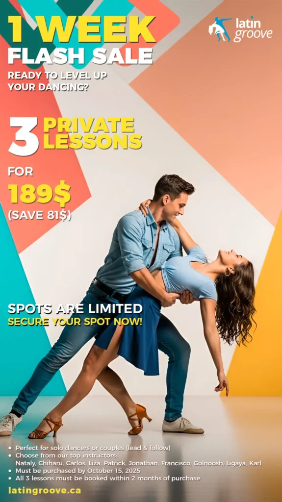 Take your dancing to the next level with our 1-week flash sale! Get 3 private lessons for just $189 and save $81. Whether you’re solo or dancing with a partner, this limited-time offer is perfect for focused, personalized coaching. Must be purchased by October 15, 2025. All lessons must be booked within 2 months of purchase.