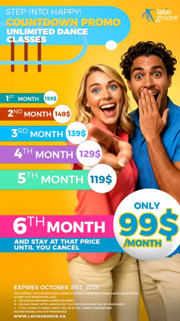 You all asked for it, and we had to bring it back! The countdown promotion is available until October 31, 2025. Make sure you benefit from this amazing offer and enjoy all the unlimited classes offered at the best price in all of Montreal. Do not hesitate to check out the conditions of the offer, so you can make sure you get the best deal on the 6th month of your subscription.