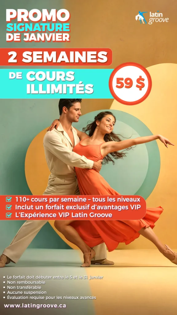 La Promo Signature de Janvier est l’occasion idéale d’essayer Latin Groove sans engagement. Profitez de 2 semaines de cours de danse illimités pour seulement 59 $, exclusivement pour les nouveaux élèves.
