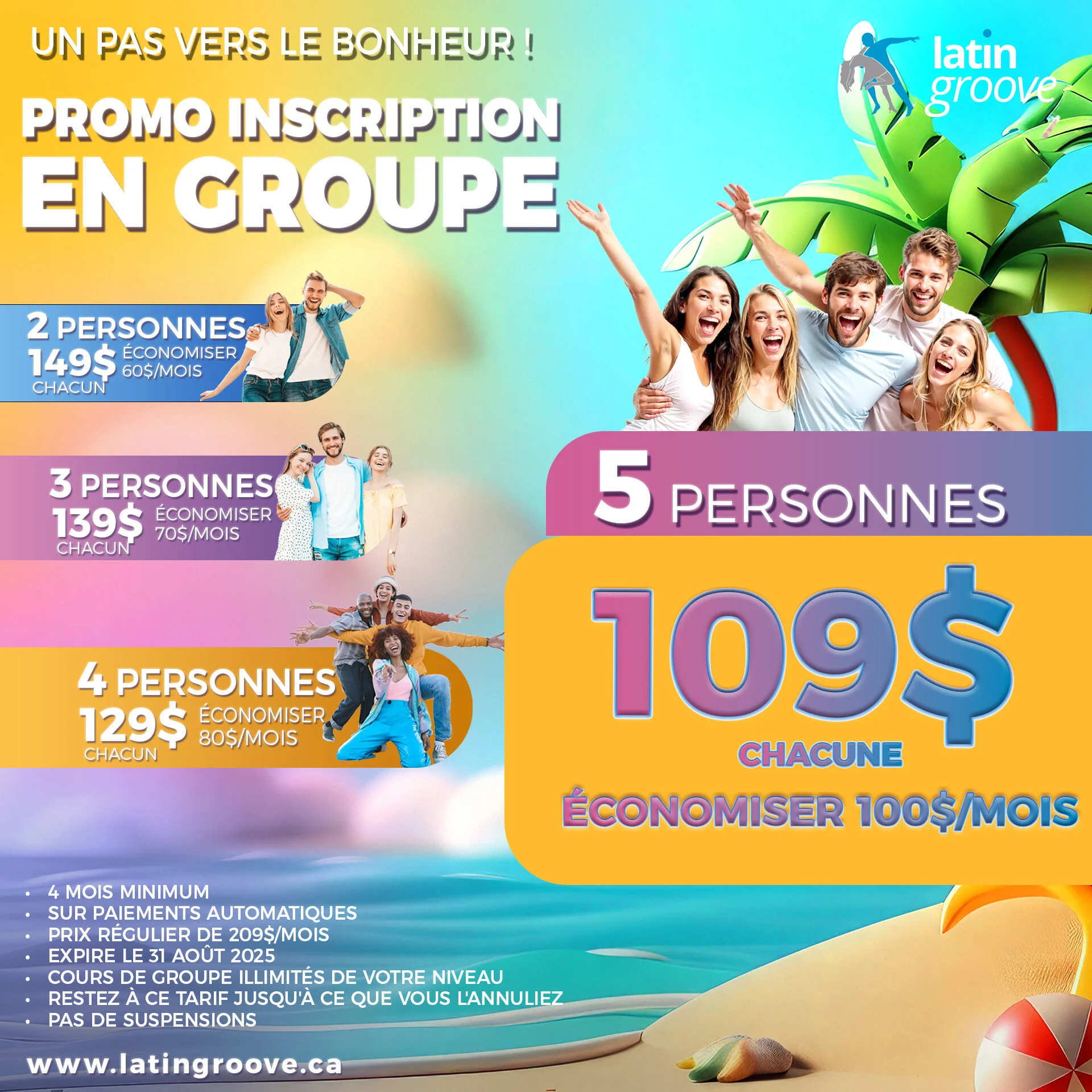 Profitez de 6 mois de cours de danse latine illimités pour seulement 649 $ ! Accédez à la salsa, la bachata, la kizomba et plus encore — avec 10 laissez-passer amis et 6 laissez-passer Palladium pour partager le plaisir. Valide dans nos studios de Montréal et Brossard jusqu’au 30 novembre 2025.
