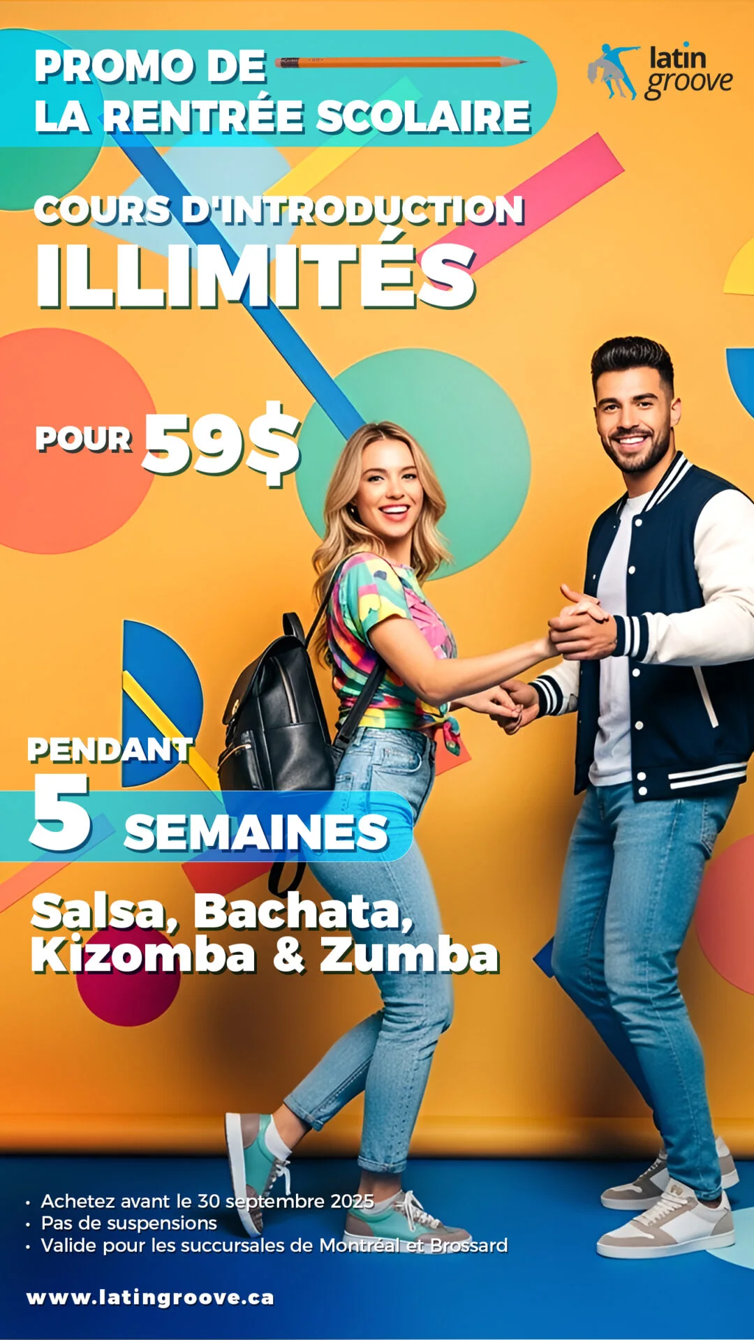 Commencez la saison avec énergie, rythme et plaisir! Pour seulement 59$, profitez de cinq semaines de cours d’introduction illimités à l’école de danse Latin Groove. Que vous soyez débutant ou que vous retrouviez votre passion, c’est l’occasion idéale de plonger dans la Salsa, la Bachata, le Kizomba et le Zumba.
