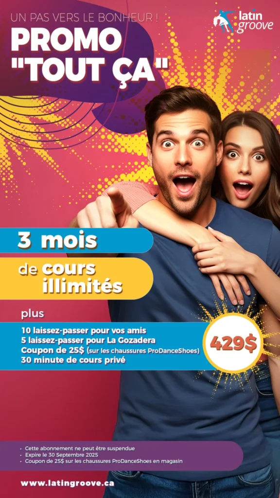 Pour seulement 429$, profitez de 3 mois complets de cours illimités, avec accès à tous vos styles latins préférés — de la Salsa et la Bachata au Zumba et bien plus encore. Mais ce n’est pas tout : nous ajoutons 10 laissez-passer pour vos amis afin de partager le plaisir, 5 laissez-passer La Gozadera pour nos soirées du vendredi légendaires, ainsi qu’un cours privé de 30 minutes pour perfectionner votre danse.
